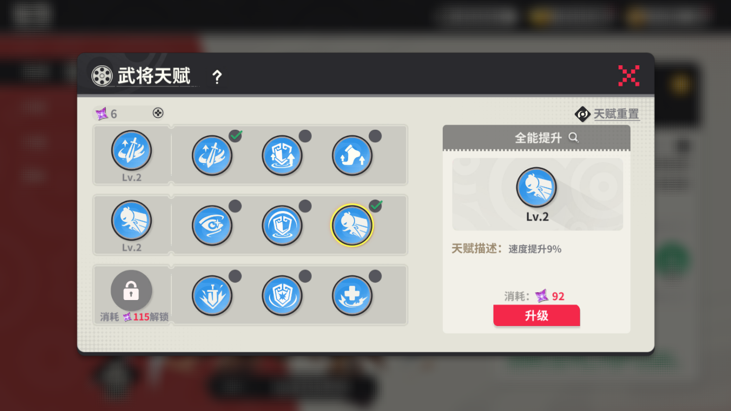 只有指定拥有武将天赋,根据武将星级解锁武将天赋阶级;每个天赋阶级拥有3个技能,通过消耗道具提升天赋技能等级;天赋等级越高,增加的技能效果,技能属性越高。