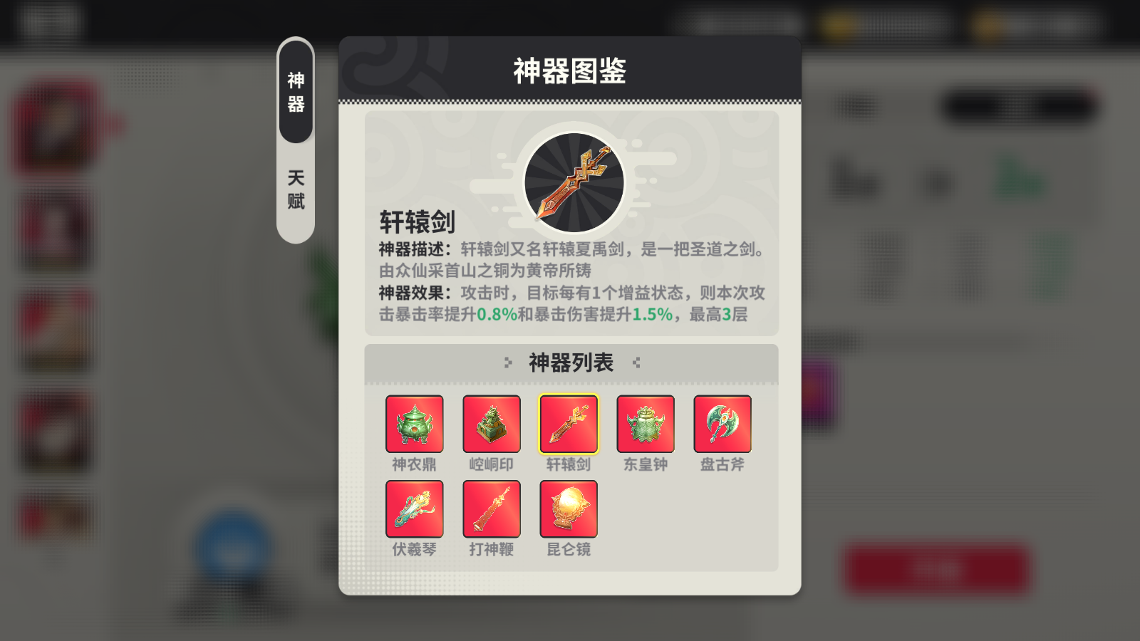 游戏内有八个不同的神器,每个神器提供的效果都不一样,主公可根据自身阵容选择搭配,神器会佩戴天赋技能,可通过重铸改变神器的天赋技能。